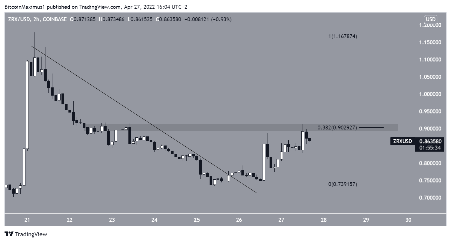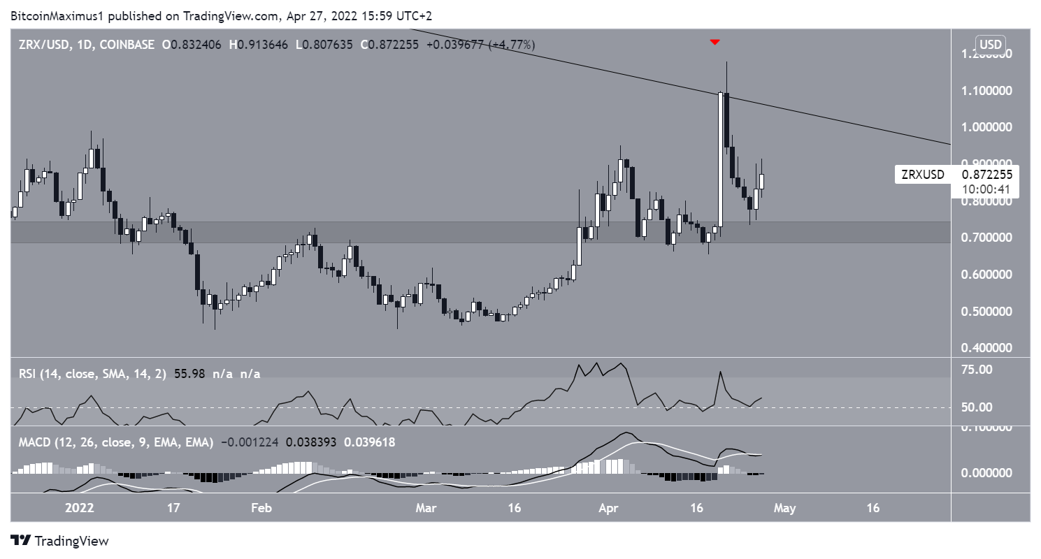 ZRX has been falling underneath a descending resistance line since reaching an all-time high price of $2.39 on April 21, 2021. The downward movement has so far led to a low of $0.245 on Feb. 24.Â