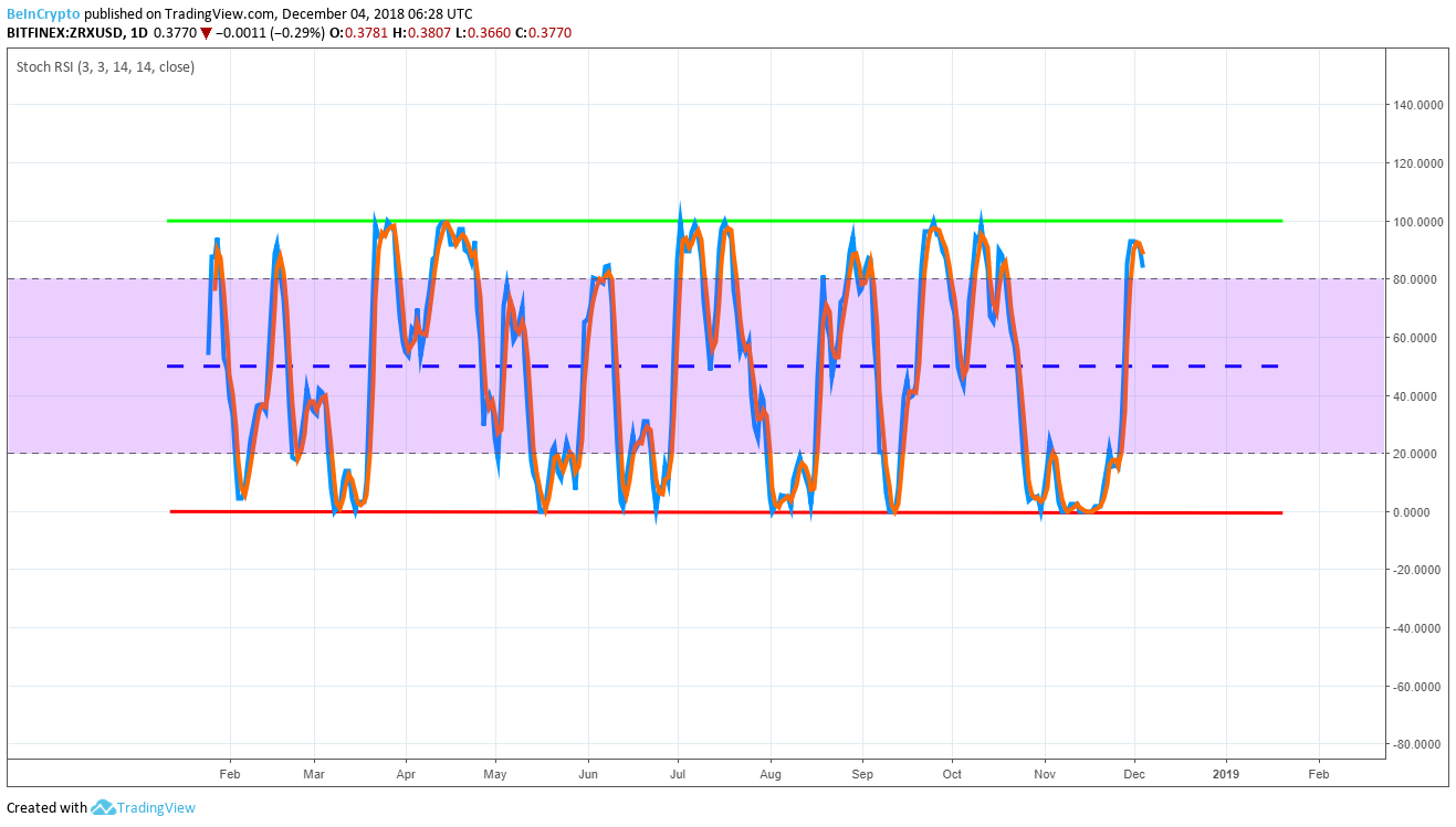 Taking a look at the three-day and two-week stochastic RSI, we can see ZRX is in the overbought territory with a value of 85 and seems to be on its way back down.