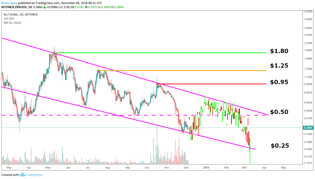 Unless Bitcoin (BTC) is able to begin a significant reversal, ZRX will most likely fail to break out of its descending trend just yet and could be forced back down yet again to test for an even lower bottom at the $0.25 level.