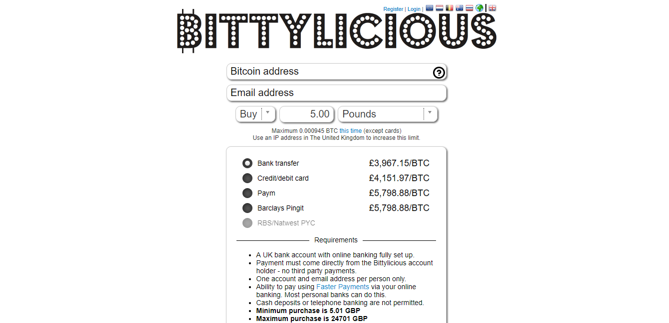In addition, while Coinfloor and CEX.io allow multiple fiat currencies to be used to buy bitcoins, Bittylicious does not. Similar to QuickBitcoin UK, Bittylicious allows cryptocurrency purchases with the pound alone.