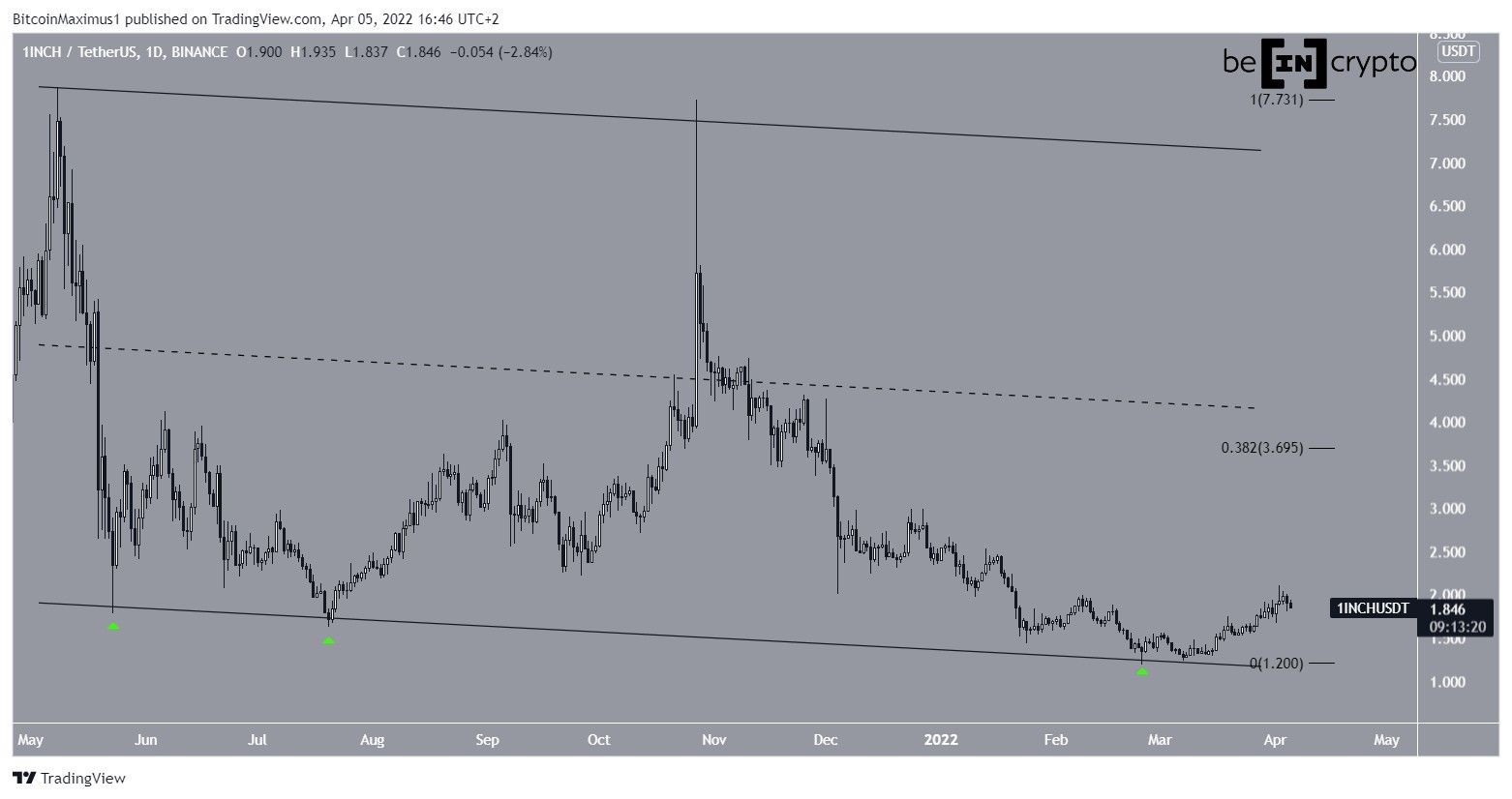 Sponsored1INCH has already broken out from a short-term descending wedge, suggesting that it has begun an upward movement. The breakout was preceded by bullish divergences in both the RSI and MACD (green lines).