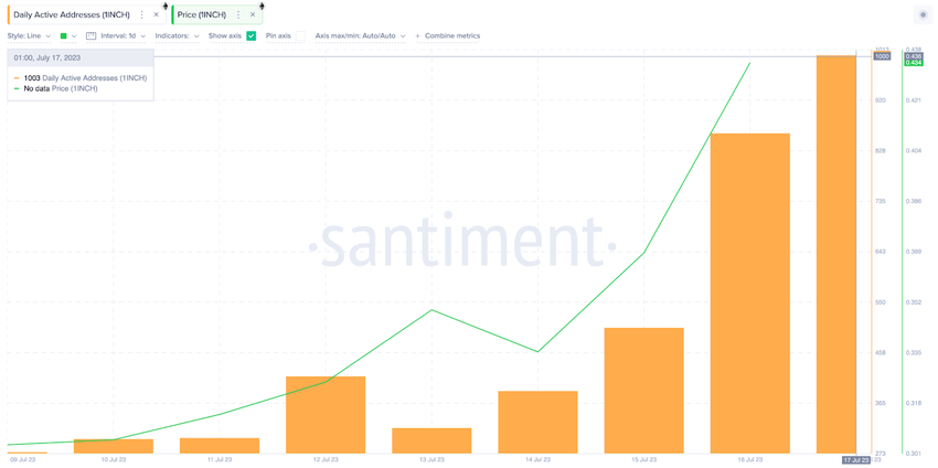 This month, 1INCH Network has consistently gained traction. According to data compiled by the blockchain intel platform, Santiment, Daily Active Addresses (DAA), the network activity has increased since the start of July.