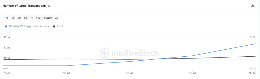 The chart below shows that on July 12, whales only conducted 8 transactions. However, that figure grew progressively to reach 50 whale transactions at the close of July 16.