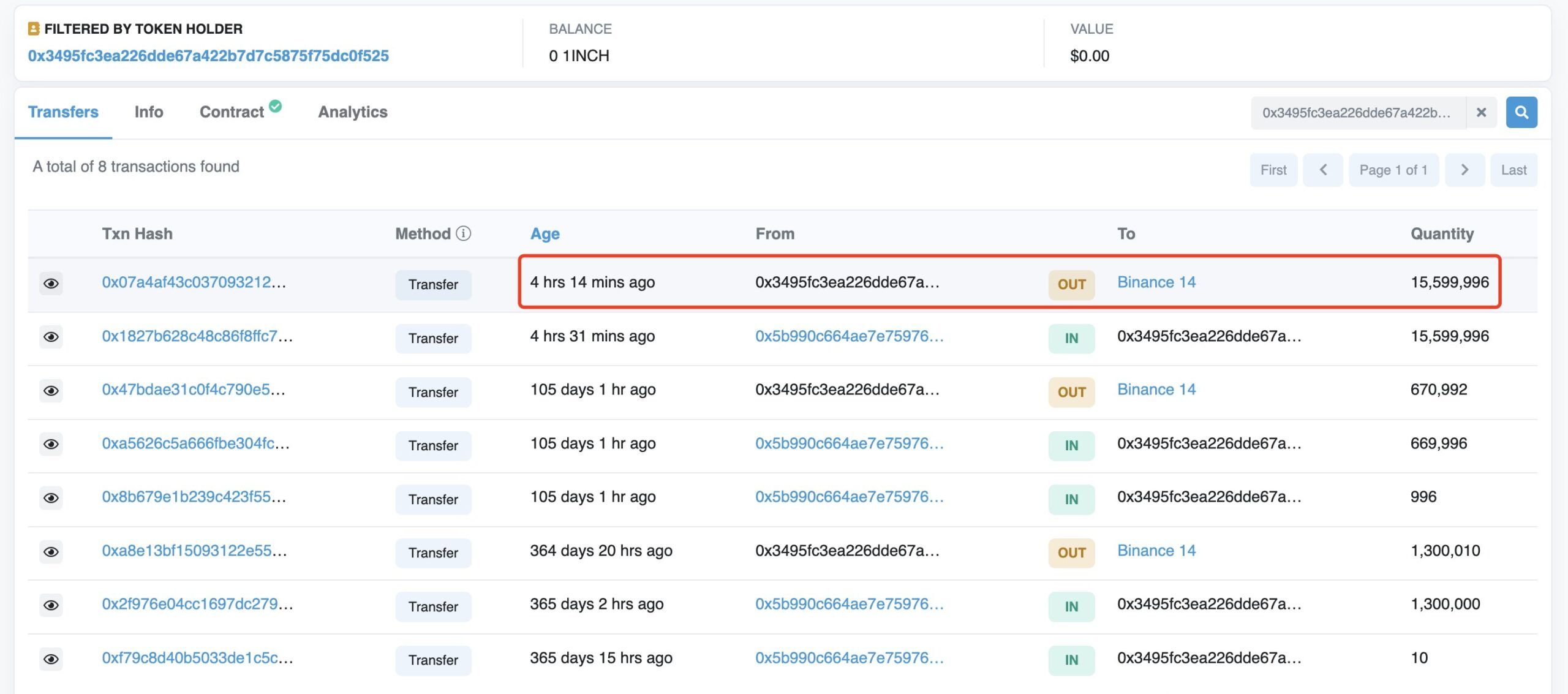 The 1inch Foundation made the transfer 18 hours before the publishing of Lookonchain’s Tweet. After that the amount was transferred to Binance 14 hours after the first transfer happened.