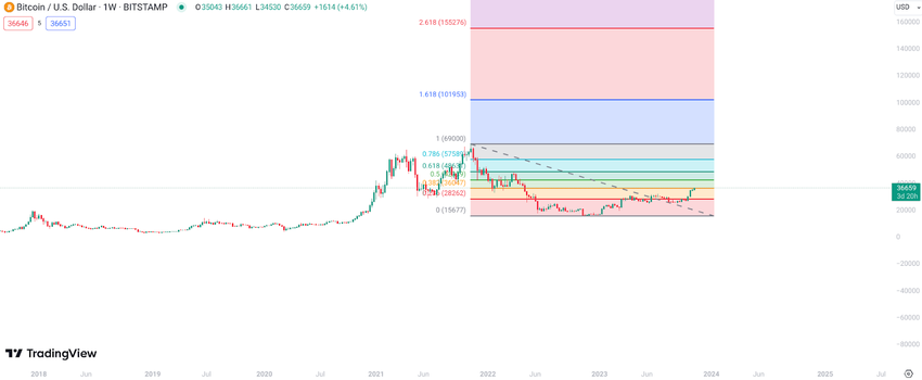 Interestingly, these predictions align with the upcoming Bitcoin halving date, average bull market length, and the levels provided by the Fibonacci tool.