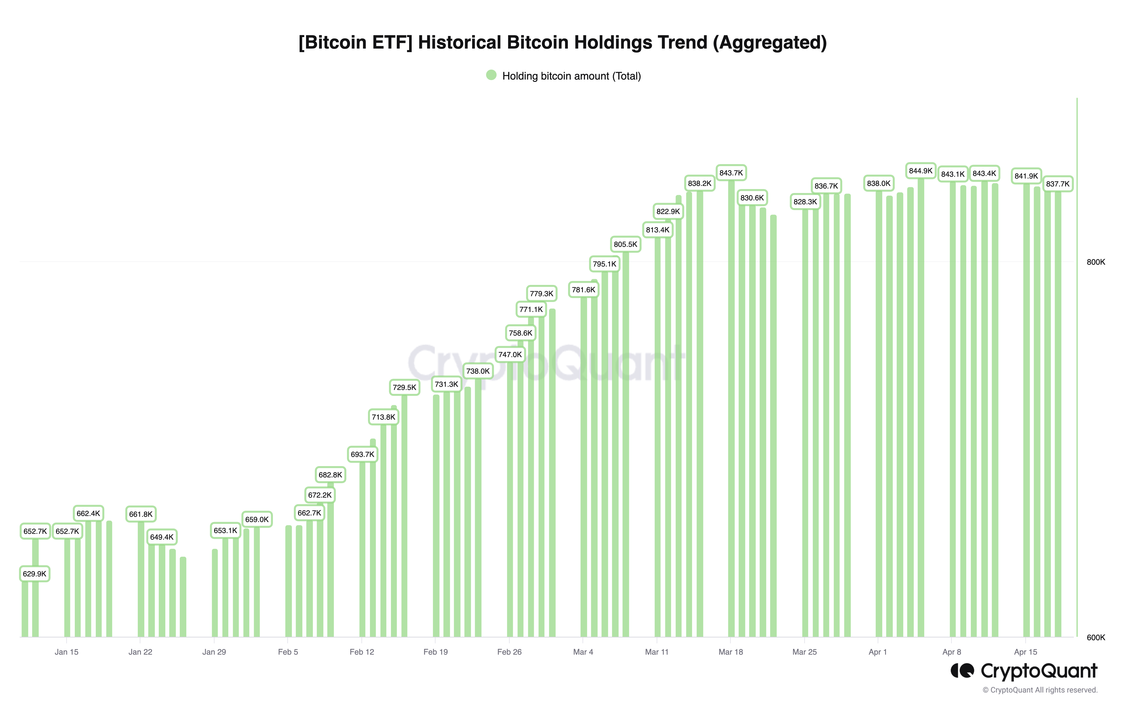 This integration has not only stabilized price volatility and demonstrated Bitcoin’s enduring presence in the financial ecosystem. It has also opened the floodgates to meet the growing demand from institutional investors. Collectively, spot Bitcoin ETFs now hold over 837,700 BTC, worth $53.61 billion.