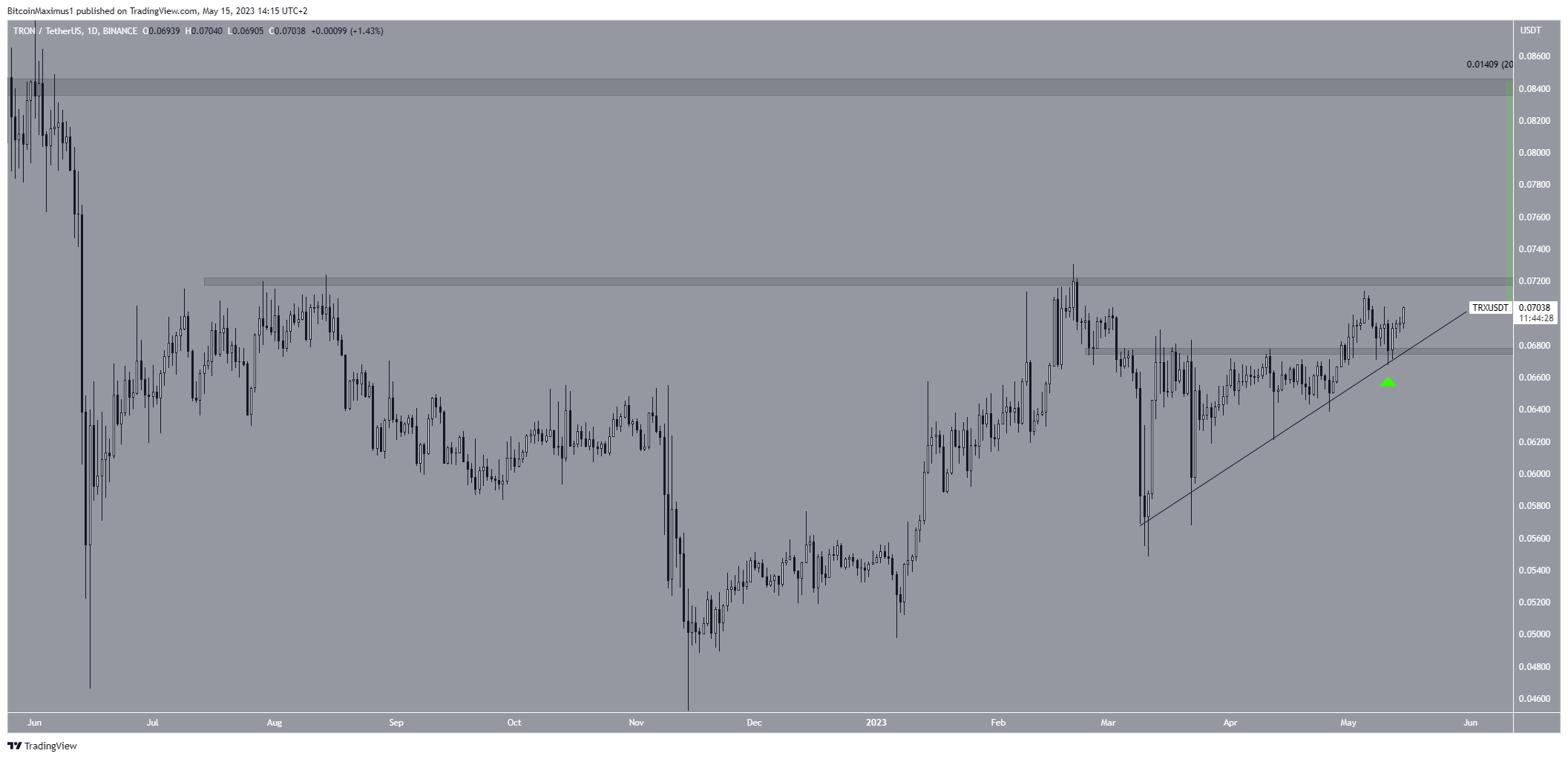 In the case of the TRX price, most of the increase occurred on Friday and continues today. On May 11, the TRX price bounced at the confluence of support levels created by an ascending support line and the $0.068 horizontal area.