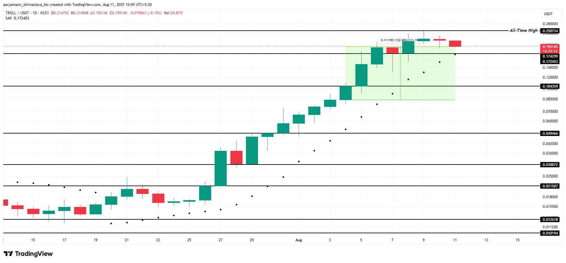 The Parabolic SAR indicator, located below the candlesticks, is signaling an uptrend, suggesting that TROLL’s positive momentum could continue. This bullish signal could push TROLL past its ATH of $0.250, paving the way for a new ATH near $0.300.