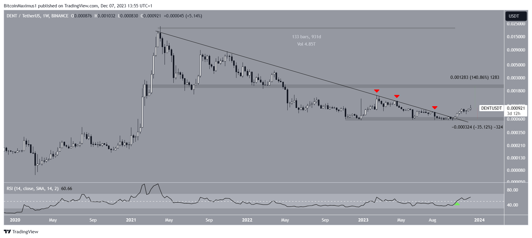 The DENT price has fallen under a descending resistance trend line since March 2021. The decrease culminated with a low of $0.00056 in December 2022.