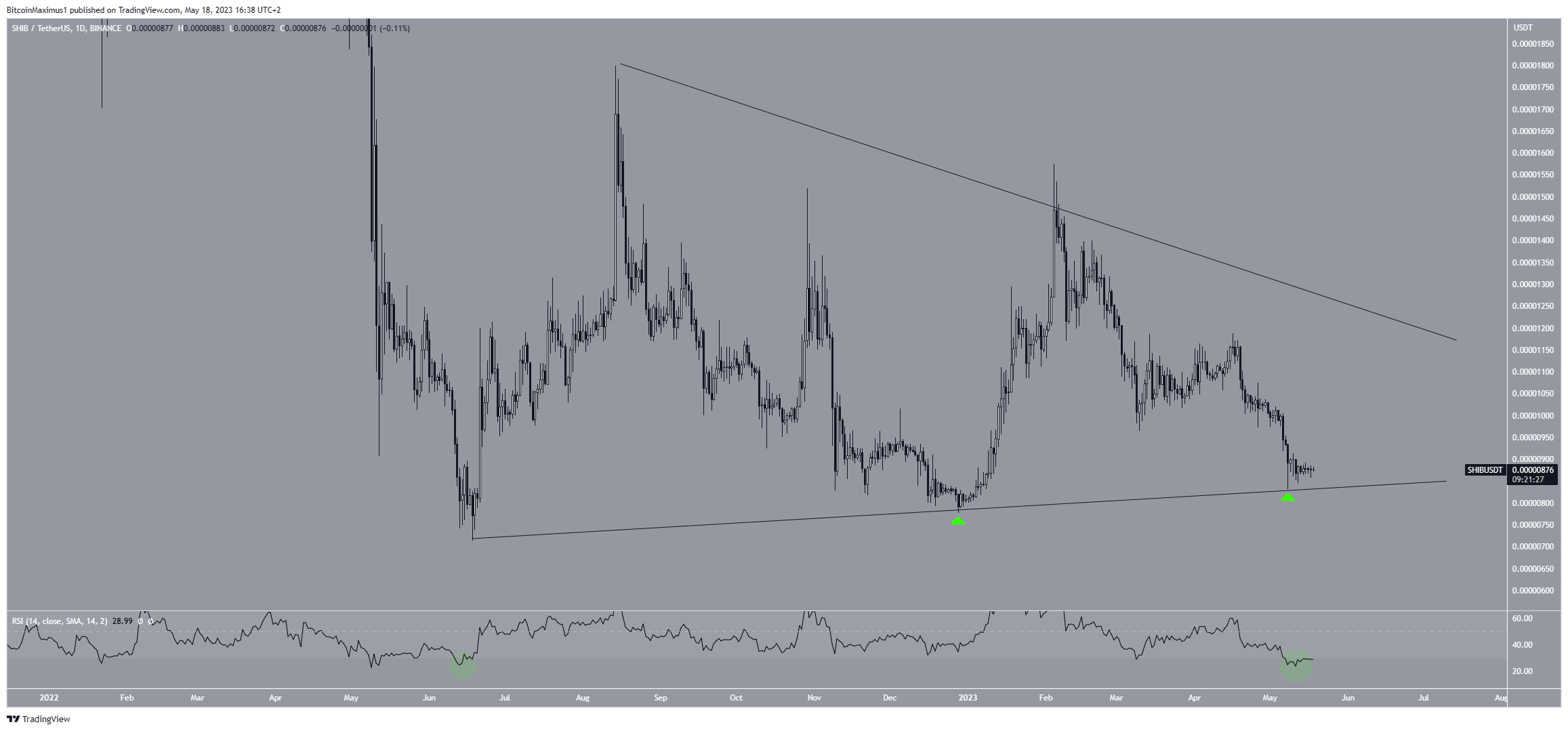 On May 8, the SHIB price bounced at the triangle’s support line, which hadn’t been touched since the beginning of the year (green icons). However, the price has yet to initiate a significant increase.