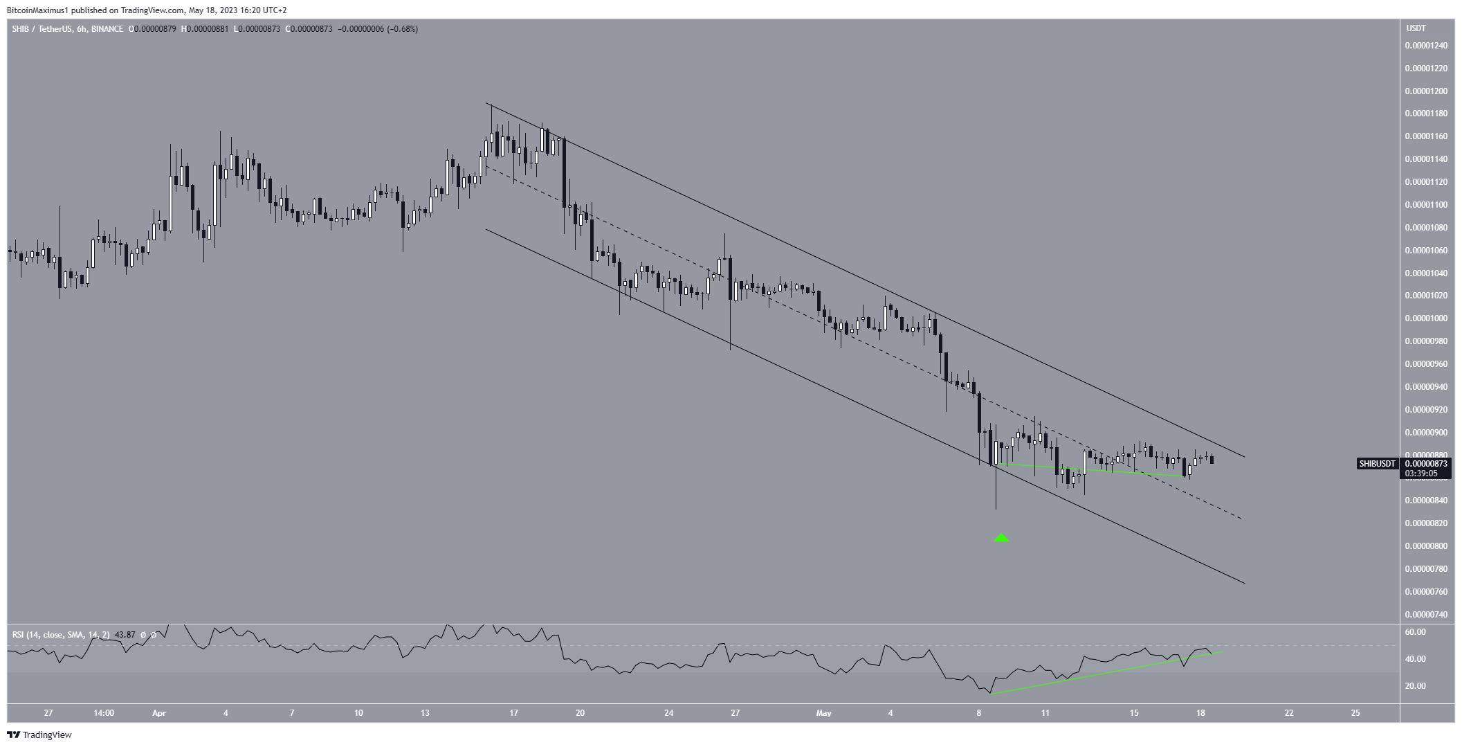 On May 8, the price of Shiba rebounded at the support line of this pattern, causing a long lower wick (represented by a green icon). Even though the price has not broken out, it is now trading in the channel’s upper portion. This is a sign that often leads to breakouts.