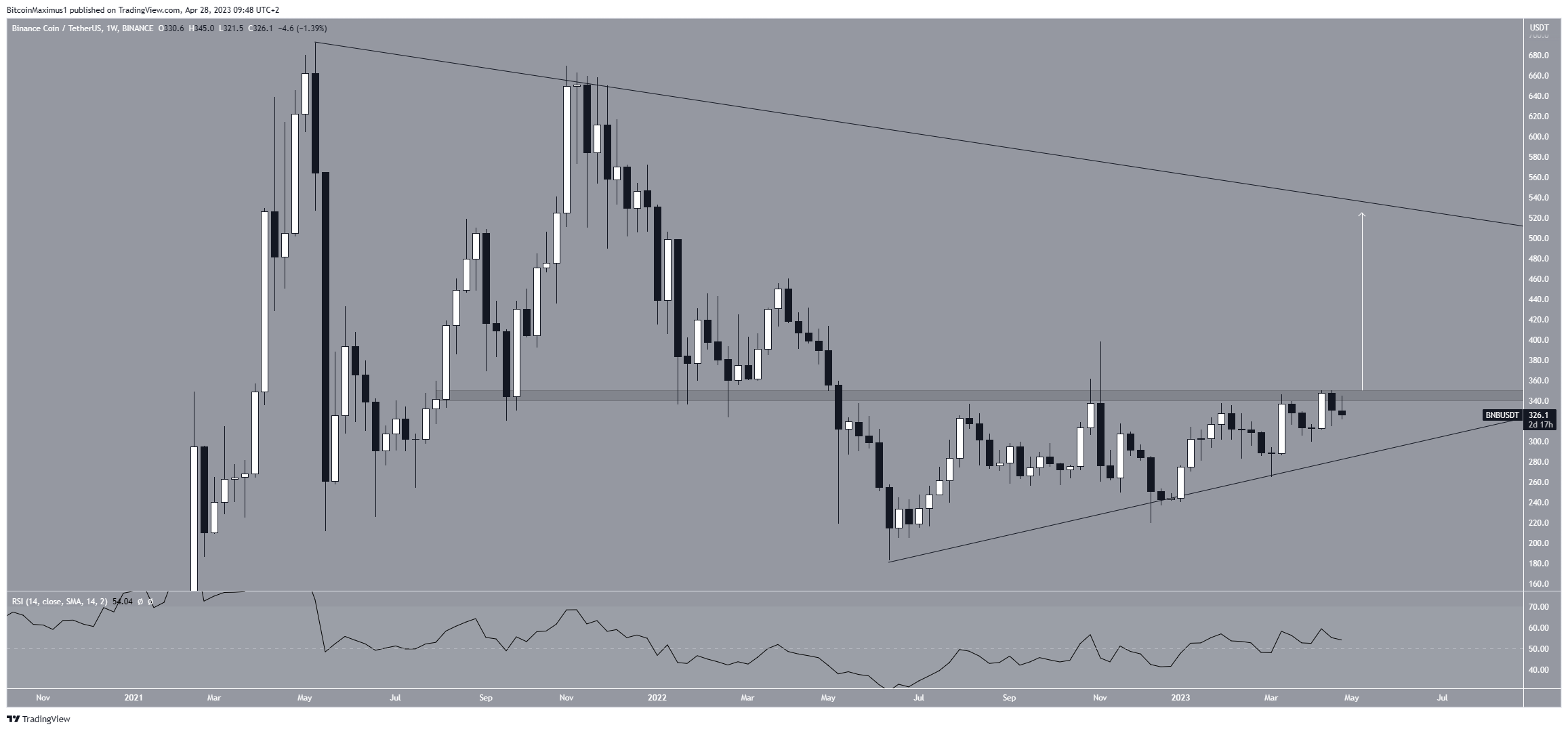 The BNB price has increased considerably since its June 2022 low of $183. During this period, it followed an ascending support line, which measured the slope of the increase. Besides the line, the BNB price also faces resistance from the $345 horizontal resistance area.