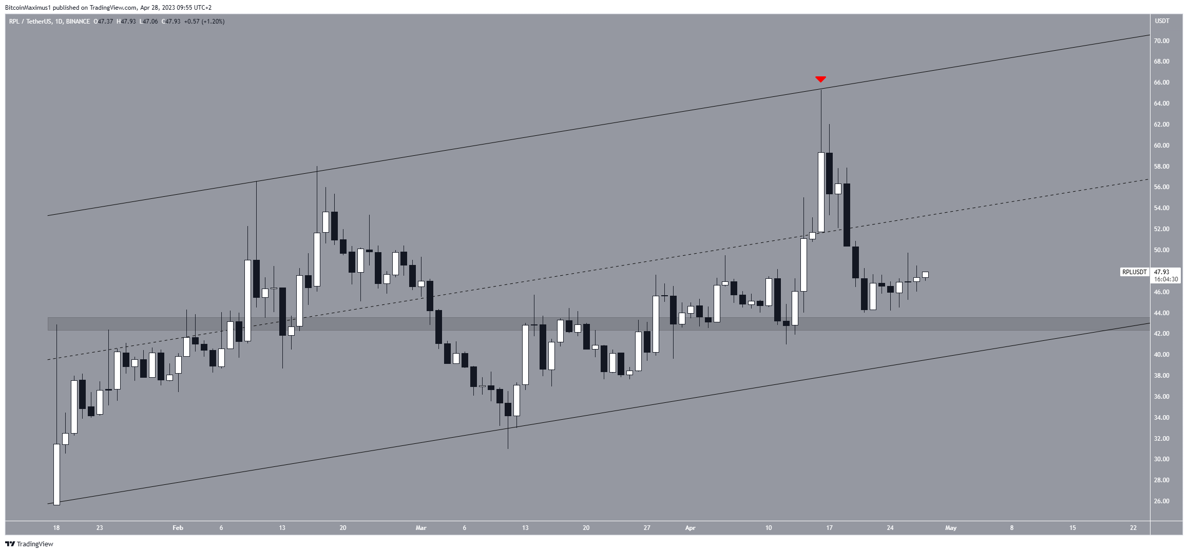 The RPL price has increased inside an ascending parallel channel since January 18. While doing so, it reached a new all-time high of $65.30 on April 16.