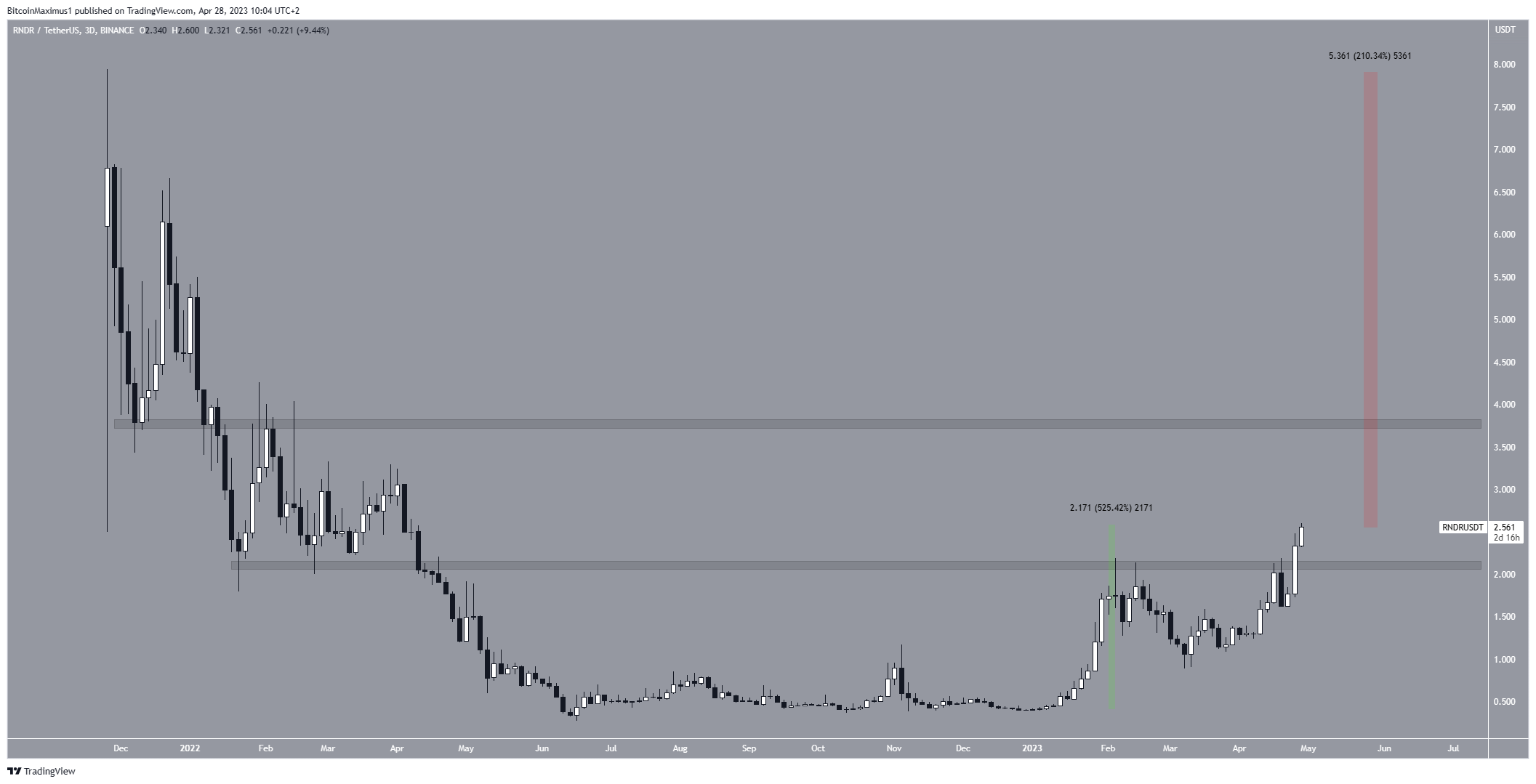 The RNDR price has been one of the biggest gainers since the beginning of 2023, increasing by 500% in the process. This week, it managed to clear the $2.10 horizontal resistance area. This was a crucial level since the price had traded below it since April 2022.