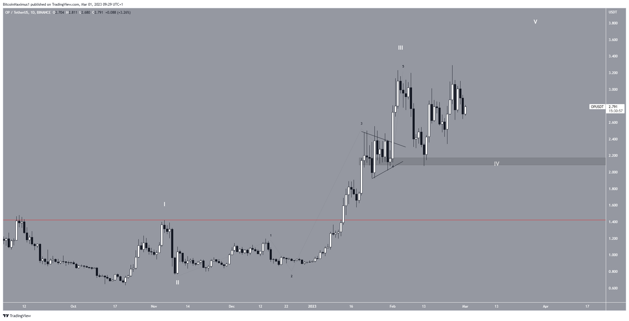 SponsoredThe OP price is likely in wave four of a five-wave upward movement (white). The most likely level for the correction to end would be at the $2.10 horizontal support area, which is in sub-wave four territory. Then, the increase can continue toward $3.80.