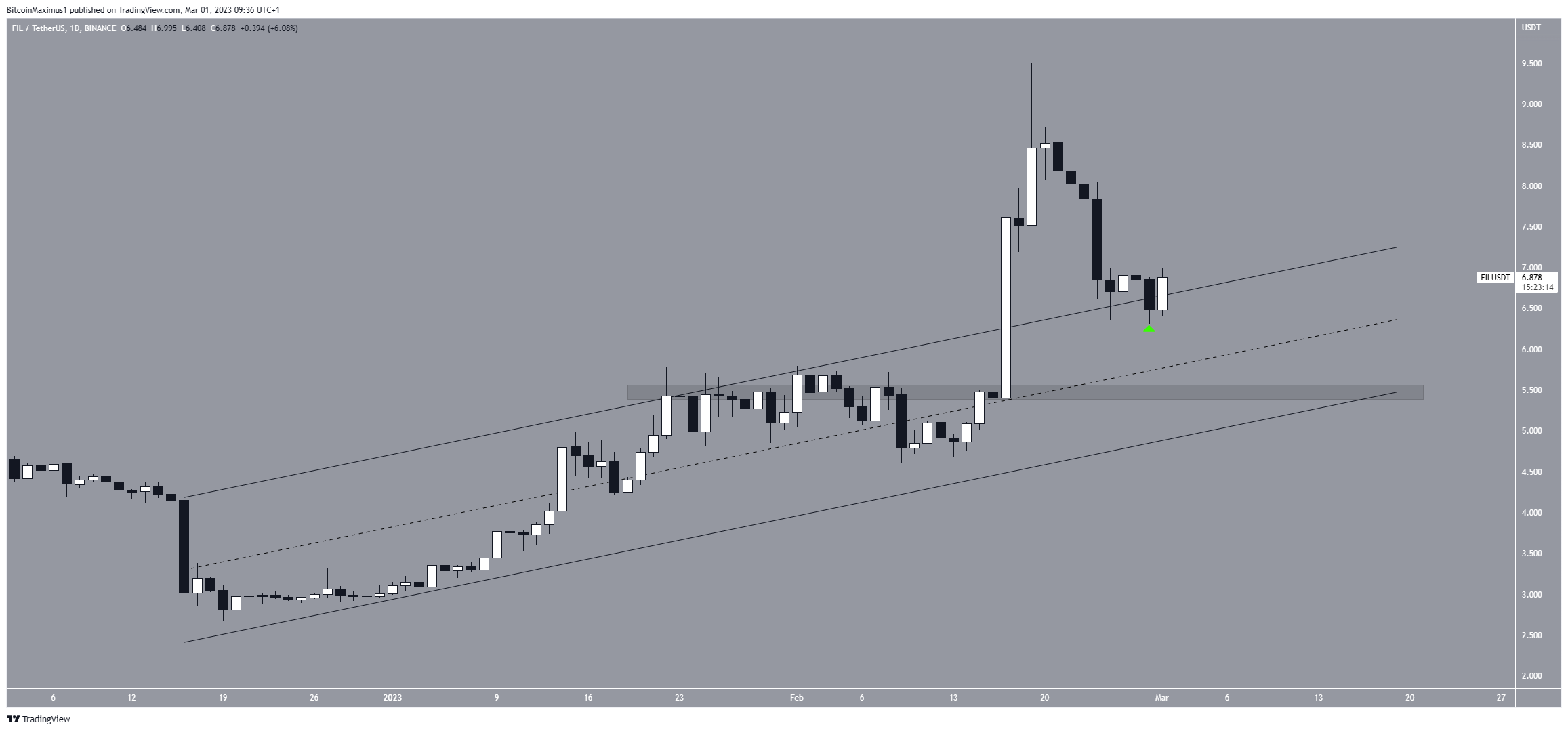 The Filecoin price is validating an ascending channel as support (green icon). If successful, this could also create a bullish engulfing candlestick.