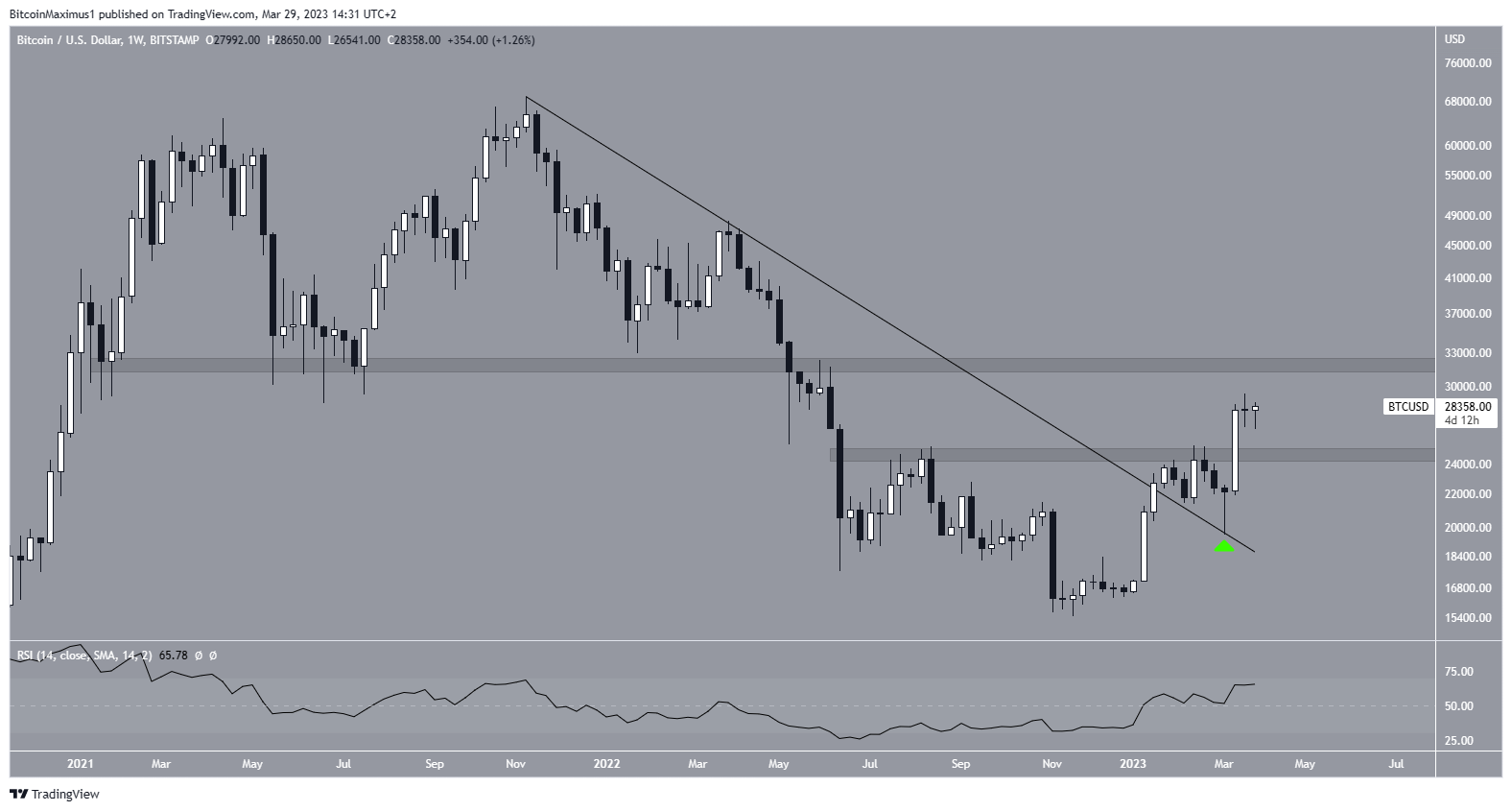 On March 13-20, the Bitcoin price closed the most bullish week in more than three years in March, increasing by 27%. This confirmed the breakout and retest from the long-term descending resistance line in place since the all-time high. Additionally, it caused the weekly RSI to move above 50 decisively.