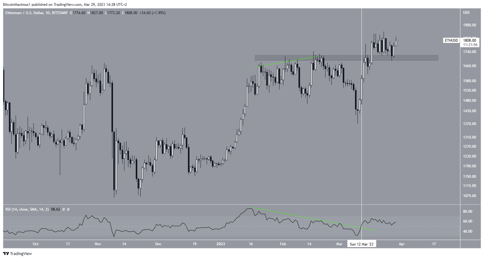 The ETH price now trades above the $1,700 area and validated it as support. This is another bullish sign, aligning with the breakout from the divergence trend line. As a result, an increase toward $2,000 is likely as long as the price does not close below this support.