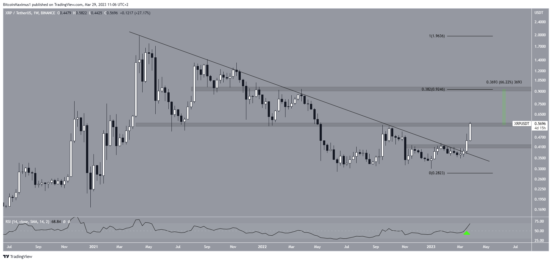 The XRP token price broke out from a long-term descending resistance line in the second week of March, while the weekly RSI moved above 50 (green icon). These are both considered signs of a bullish trend.