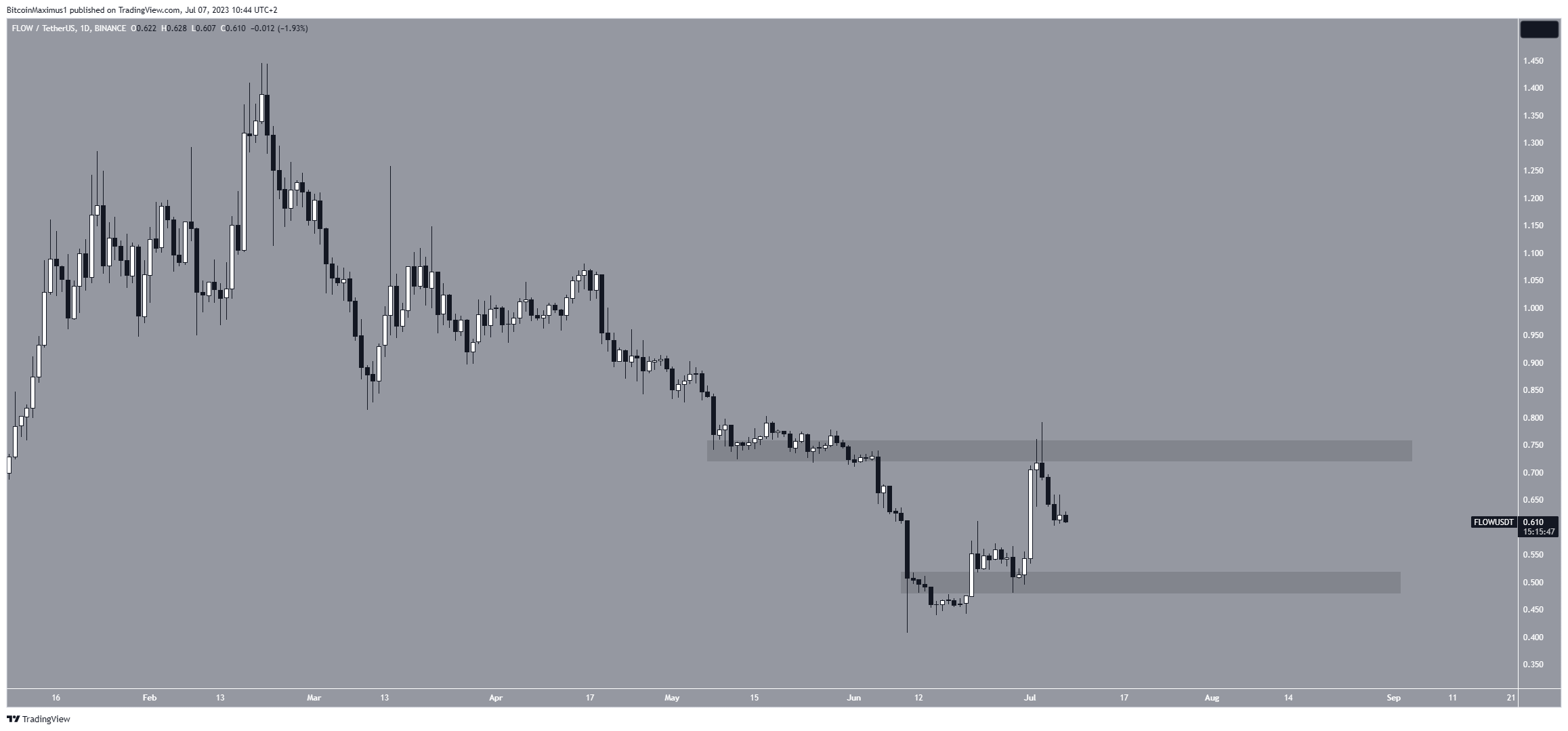 The FLOW price began an upward movement on June 10. After creating a higher low, the price reached a high of $0.79 on July 3 before falling. Currently, the FLOW price trades in the middle of a horizontal range between $0.50 and $0.75.