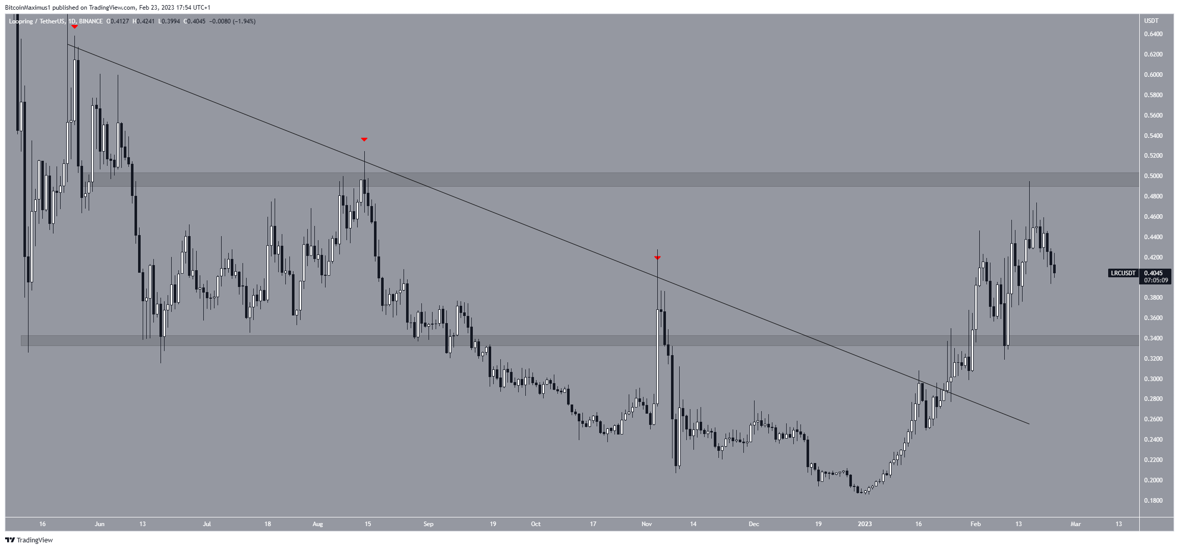 The LRC price broke out from a descending resistance line on Jan. 23. The increase led to a high of $0.49 on Feb. 16. However, the price created a long upper wick and has fallen since.