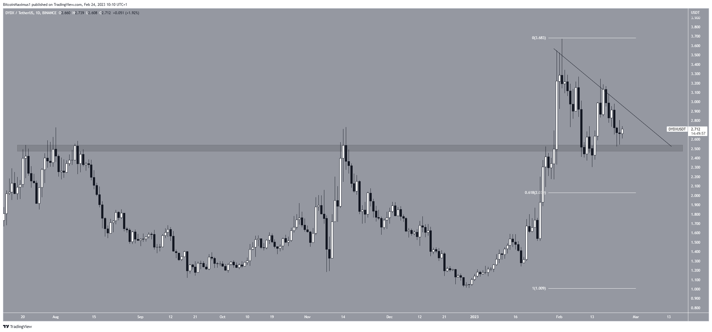 The DYDX price has fallen below a descending resistance line since Jan. 30. The line caused a rejection on Feb. 16.