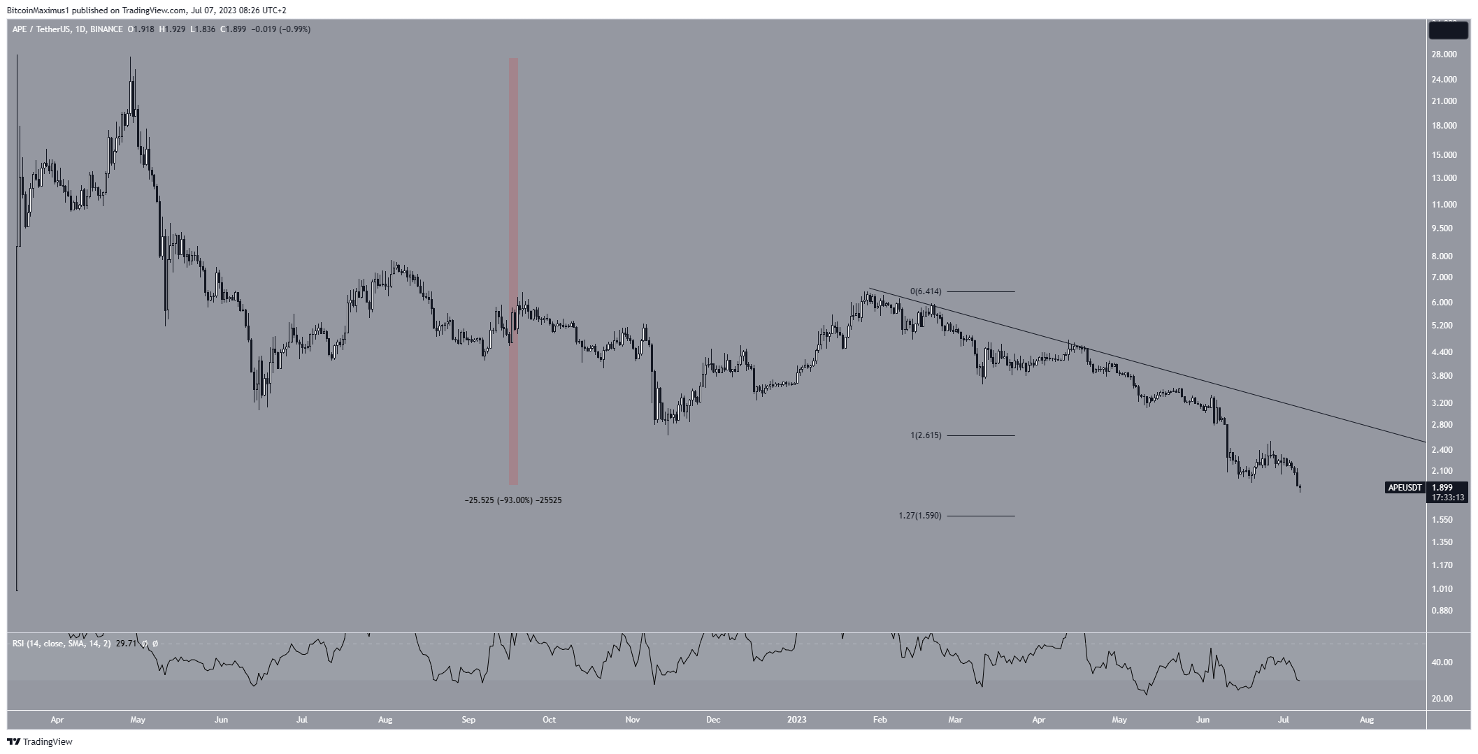 If APE continues to decrease, the next closest support will be at $1.59. However, if the price initiates a rally, it could move to a short-term descending resistance line currently at $2.50.