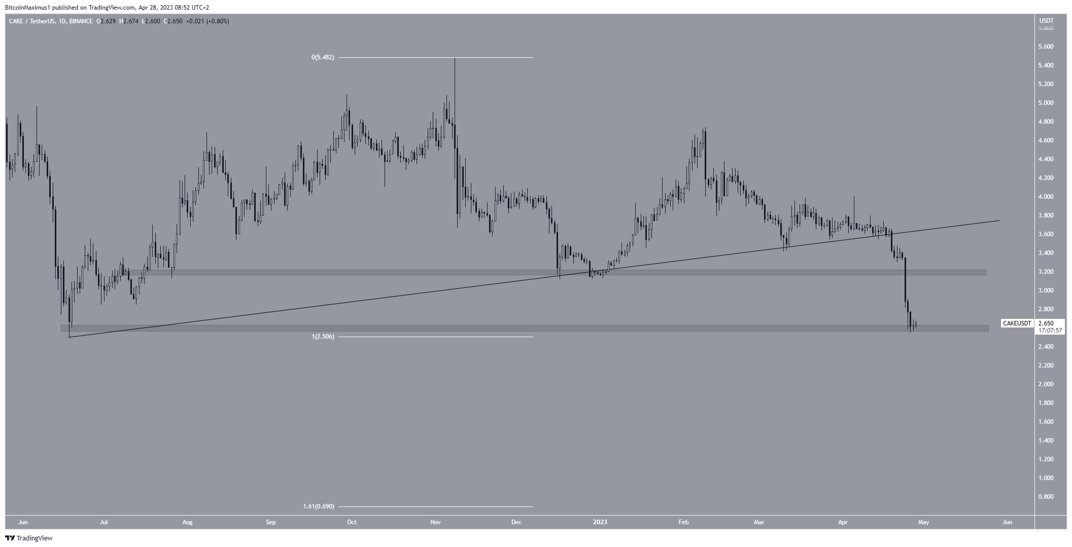 The CAKE price has decreased since it broke down from an ascending support line on April 19. Previously, the line had been in place since June 2022. Therefore, the breakdown from it means that the upward movement has ended.