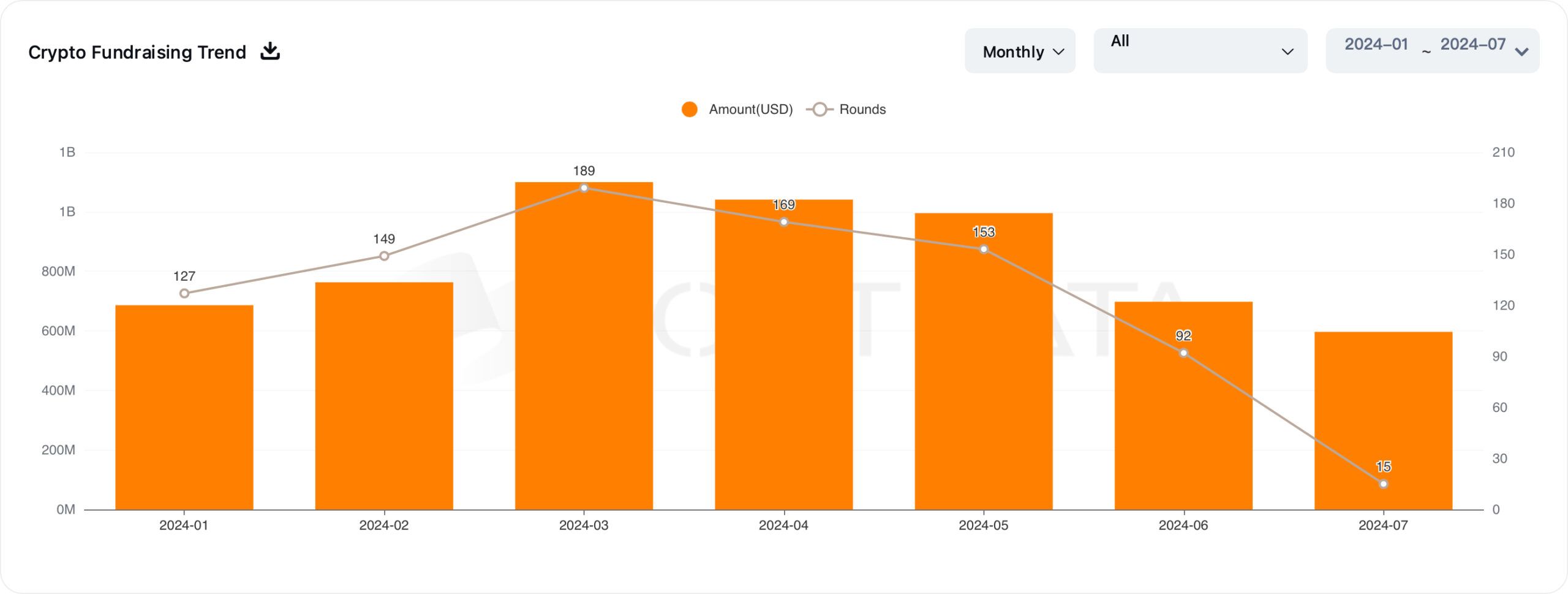 The total fundraising amount in June was $697 million, reflecting a 30% decrease from the $990 million raised in May 2024. Despite this month-on-month drop, the June 2024 total still showed a 42% increase from the $480 million reported in June 2023.