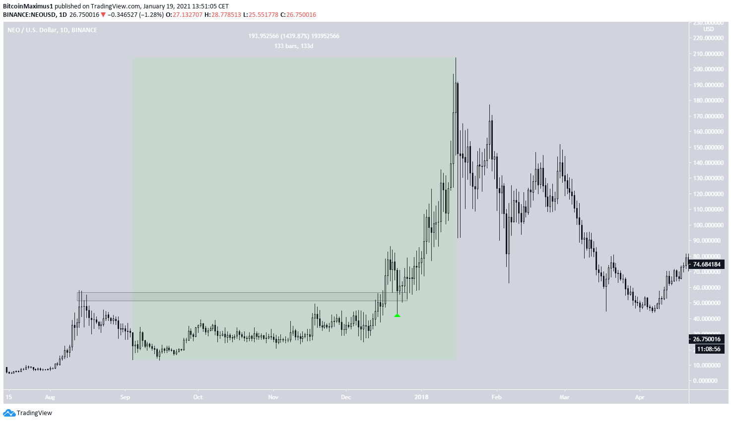 NEO managed to break out above the then all-time high resistance area after 126 days. It subsequently validated it as support on Dec. 24 (shown with the green arrow in the image below) and increased rapidly to reach the current all-time high.