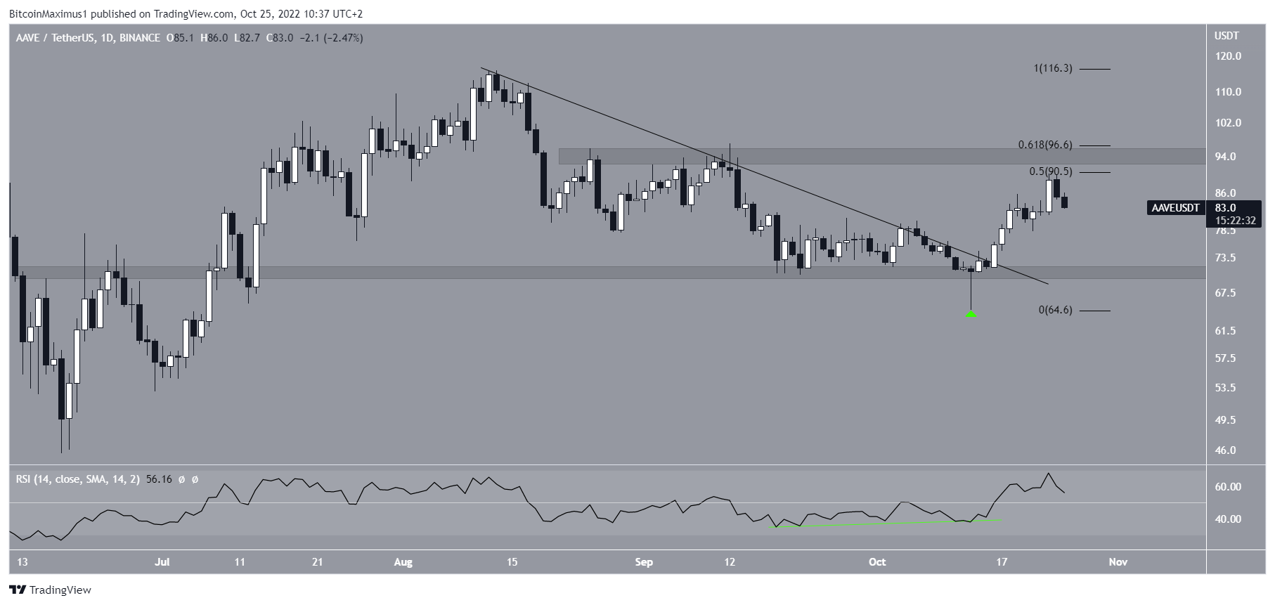 AAVE price had been falling underneath a descending resistance line since reaching a high of $115.8 on Aug. 13. The downward movement led to a minimum price of $64.7 on Oct. 13.