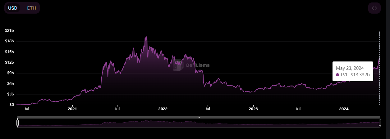 Aave, a leading crypto-lending protocol on the Ethereum network, has experienced significant growth in its total value locked (TVL), increasing by $2.26 billion since Monday. According to DeFiLlama data, this surge brought Aave’s TVL to $13.33 billion, which marks the highest level since May 2022.