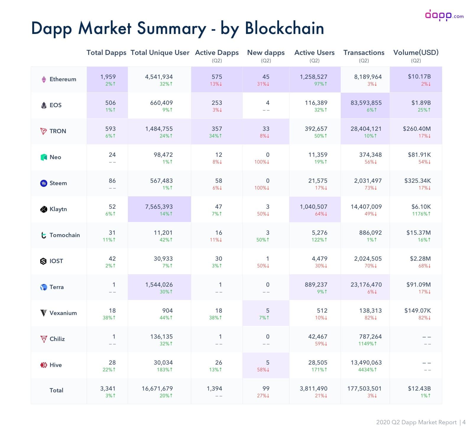 The overall DApp market summary shows that Ethereum performed the best, even if the number of new and active DApps had dropped by 31% and 13%, respectively. Notably, however, the total number of unique users has perceptibly increased, growing by 32%.