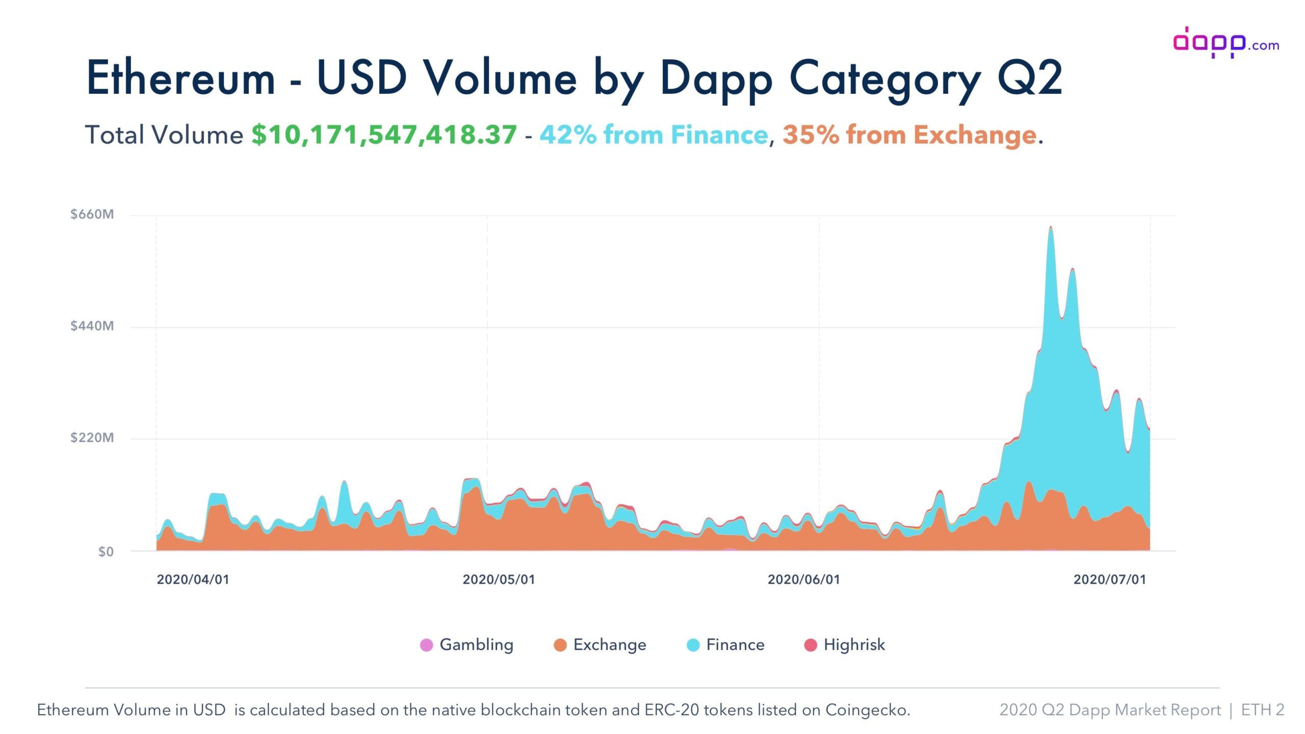 Lending protocols like Compound have sparked the arrival of several yield farming programs, which lets users earn interest on assets that don’t need to be stored or staked. The average number of DApp users on Ethereum increased by 48% after COMP was released. Additionally, 97.5% of the Q2 DApp volume on Ethereum was related to DeFi products and services.