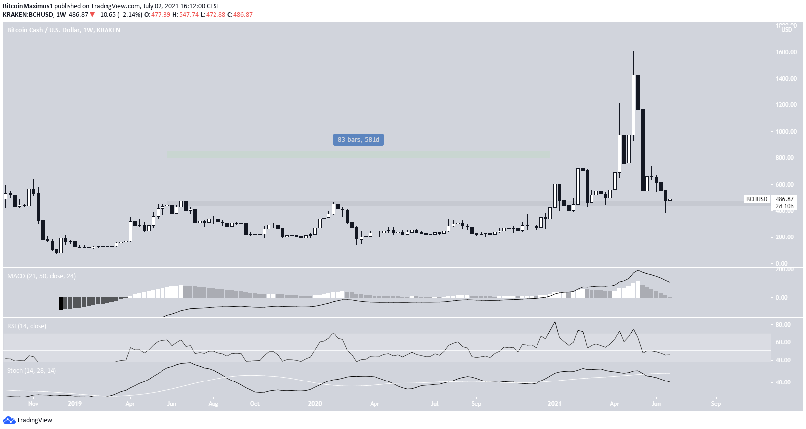 Bitcoin Cash (BCH) has decreased considerably since the beginning of May but has bounced at the $450 horizontal support area.
