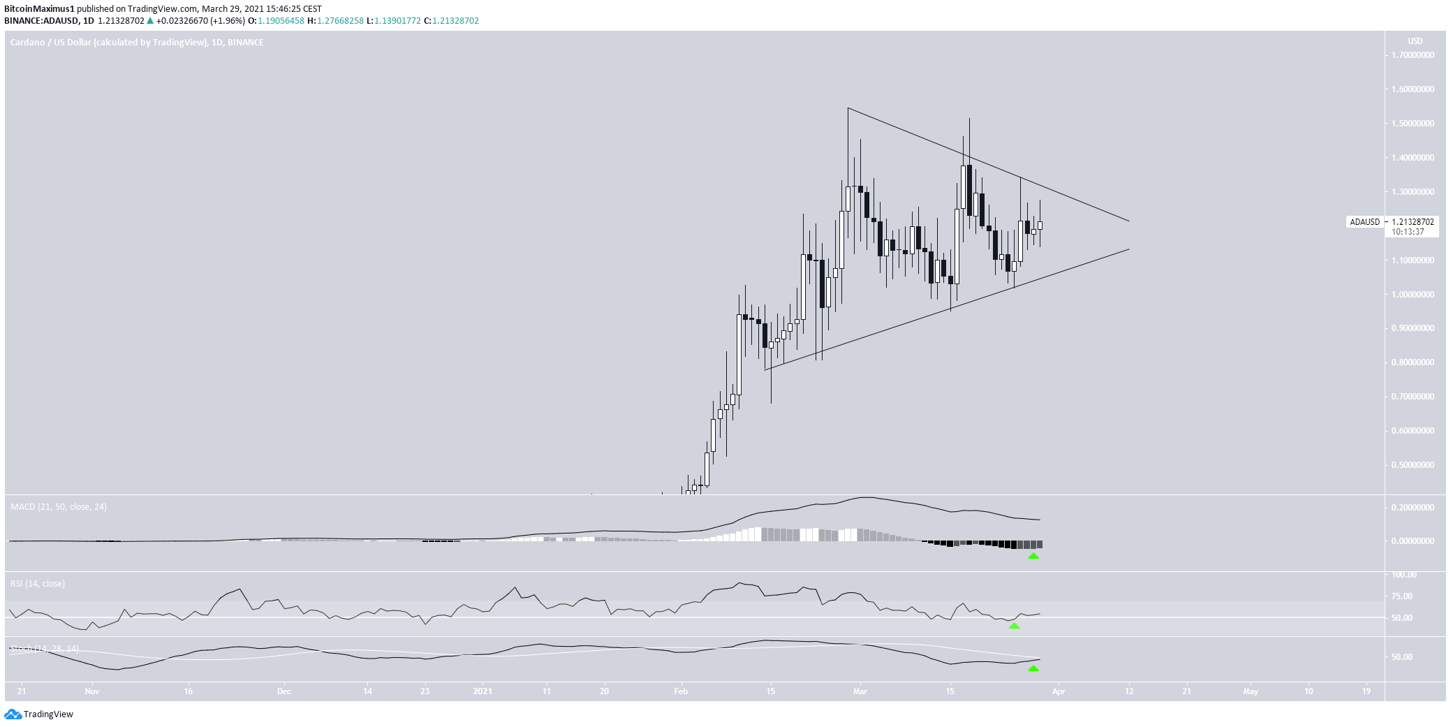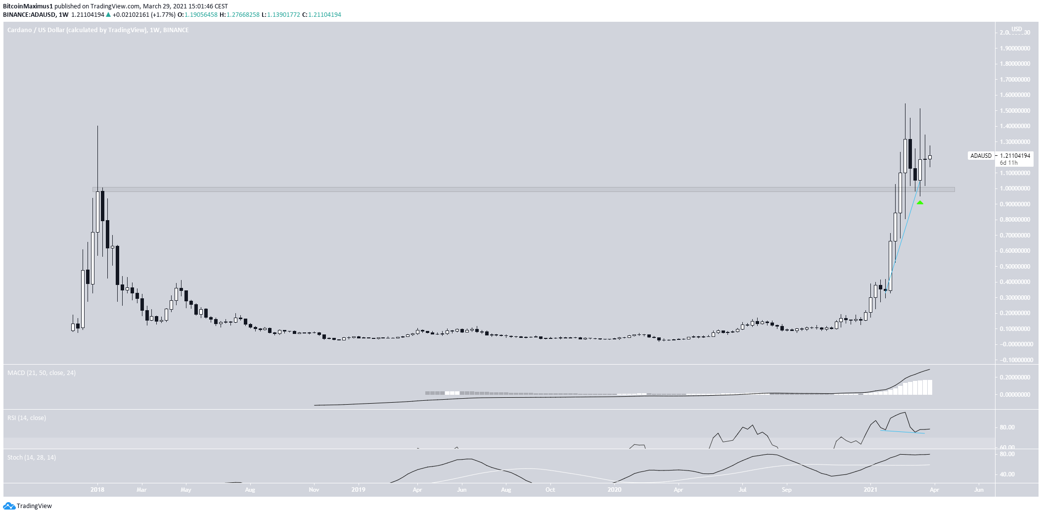 On Feb. 27, the token reached a new all-time high price of $1.54. It dropped almost immediately afterward, but this only served to validate the previous all-time high level of $1 as support (green arrow). Since then, the token has been moving upwards.