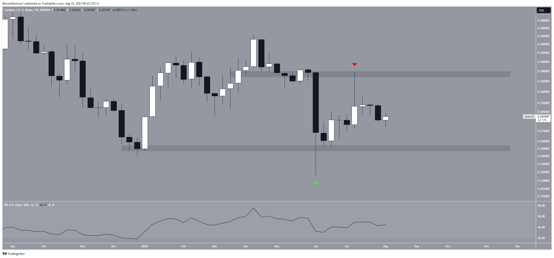 While ADA reached a high of $0.38 in July, it failed to break out from the $0.38 horizontal area. Then, it validated it as resistance (red icon). The ADA price now trades between the $0.25 and $0.38 areas.