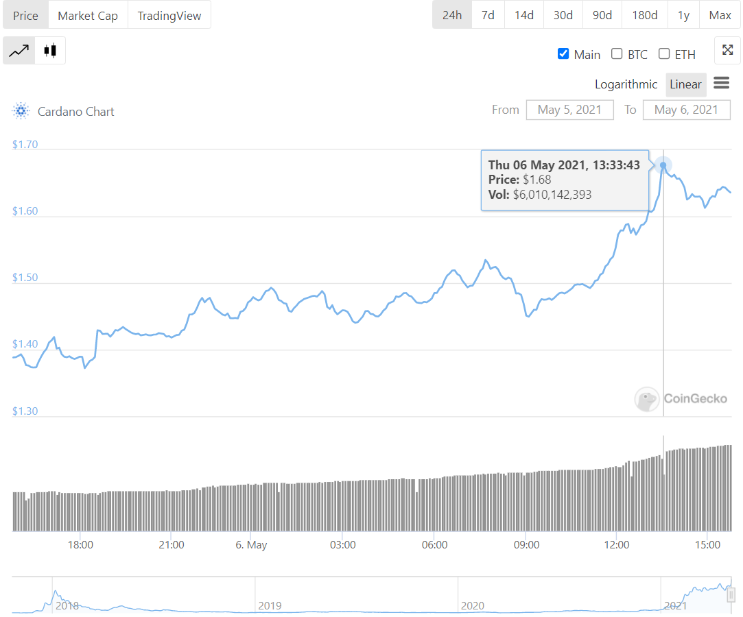 The seventh largest cryptocurrency by market cap, Cardano, has continued its bullish run to reach an all-time high of $1.68 today. ADA has been watched closely with many expecting it to rise due to multiple factors, including potential for smart contract capabilities.