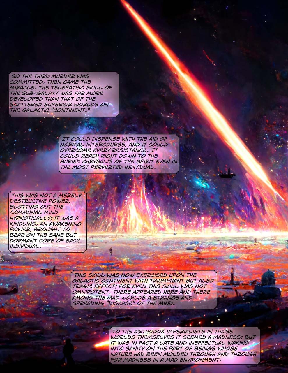 Hess says Midjourney is excellent at some things and still absolutely terrible at others. “It’s very difficult to generate action scenes – or human figures at all. You can’t create the same character over and over again, and so on. However, Star Maker is an unusual book in several ways. It almost doesn’t have a main character – the narrator swiftly becomes a disembodied presence that watches civilizations rise and fall. There are no fight scenes, but lots of philosophical musings and observations. The exact visual details of anything described in the book aren’t particularly important except to marvel at. Furthermore, Midjourney happens to have its own art style. It is perfect for the dreamy/otherworldly mood of Star Maker.”