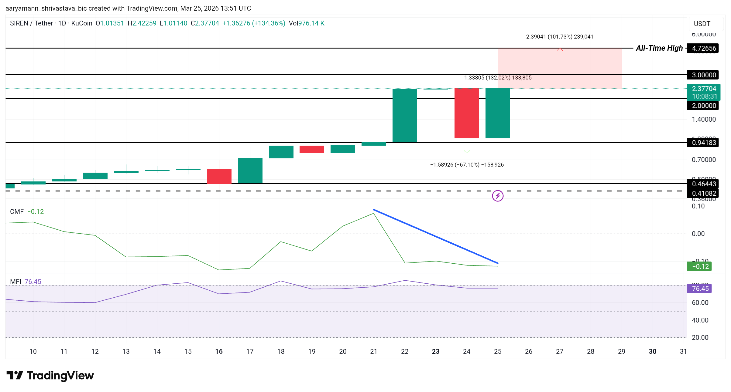 The bullish thesis targets a move toward $2.59, contingent on SIREN holding above the $2.00 level on any pullback. The ascending blue trendline on the price chart, which has provided support through the entire rally from $0.40, now sits near $1.10 and functions as the structural floor.