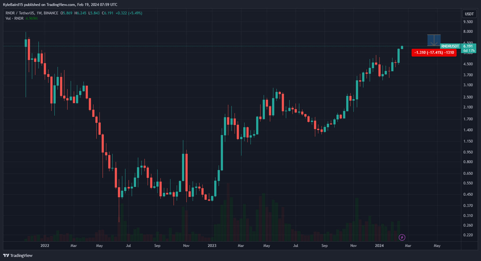 RNDR reached an all-time high near $7.50 in November 2021 but quickly sank to $0.40 in the bear market that followed. RNDR is currently trading at $6.20, almost 15% away from setting a new all-time high milestone.
