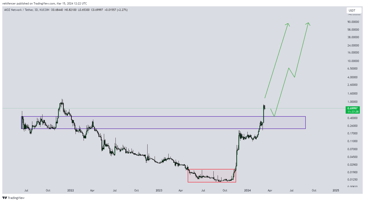 In addition, technical analyst Rekt Fencer has projected an optimistic outlook for the AIOZ token, suggesting that following a minor price correction, it could potentially escalate to $1.6, $2.6, or even $4, marking significant milestones for the cryptocurrencyâs valuation.