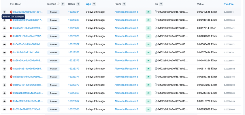 The Alameda Liquidators tried to withdraw LDO tokens while still under vesting, resulting in nine different failed transactions. Multiple failed transactions are also due to issues as silly as running “out of gas.”