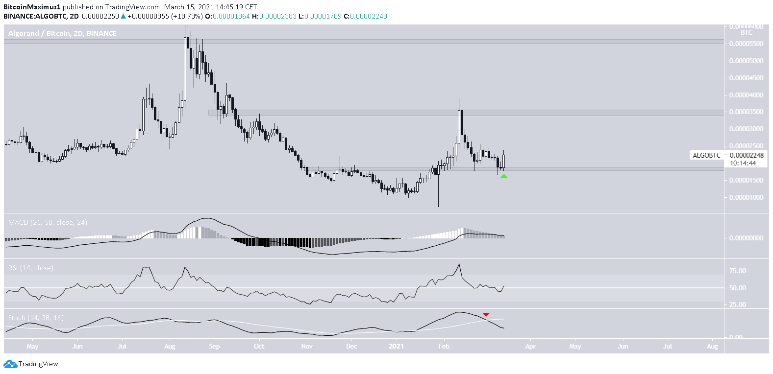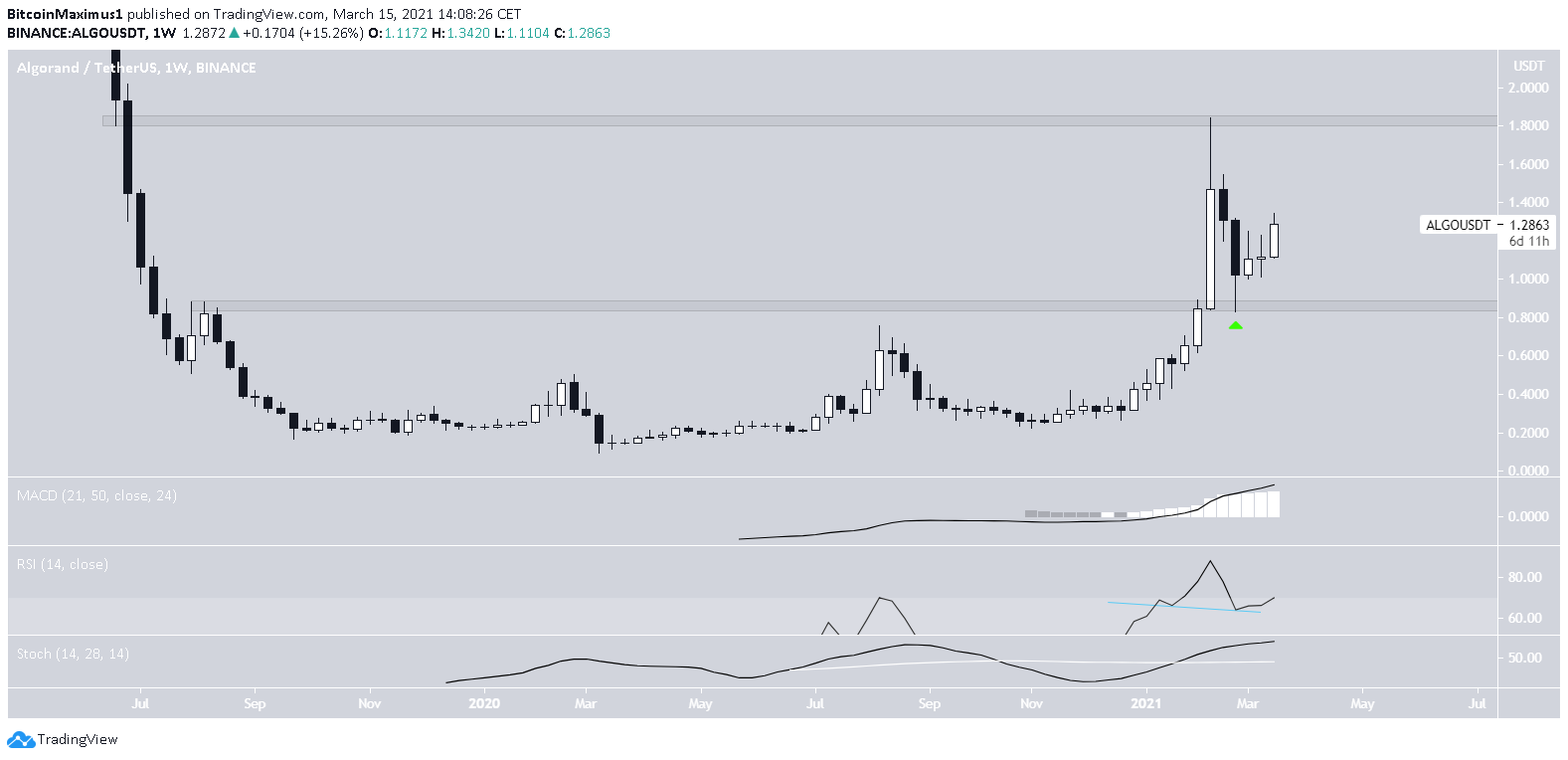 The Algorand (ALGO) price has bounced at a long-term support area and is in the process of breaking out from a mid-term resistance area.