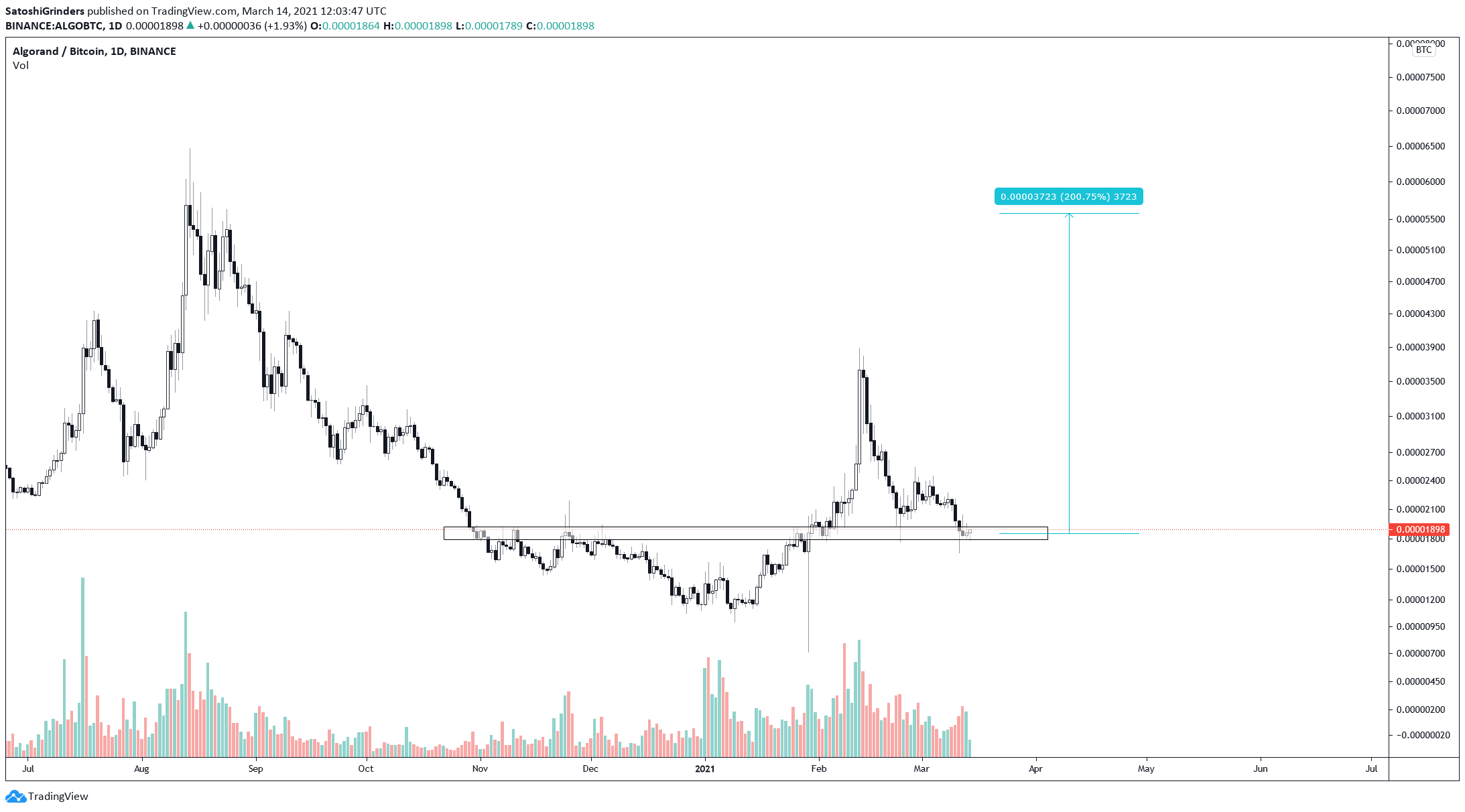 Cryptocurrency trader @Thebull_crypto outlined an ALGO/BTC chart, which shows a resistance flipped to support.