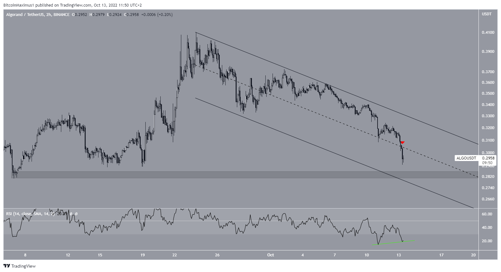 The ongoing decrease since Sept. 24 has so far been contained inside a descending parallel channel. The price held above the middle of the channel since Sept. 30, but then Algorand finally broke down (red icon) on Oct 13. This is a sign that lower prices are in store.
