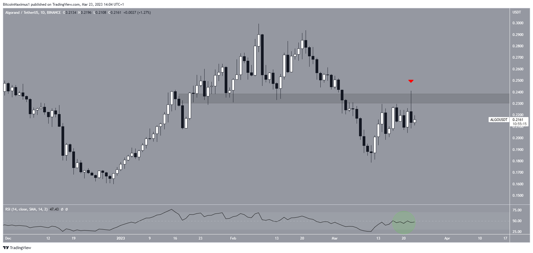 The technical analysis from the daily time frame shows that the Algorand price has fallen since creating a lower high on Feb. 21. While the price initiated a bounce on March 11, this culminated with a shooting star candlestick on March 22 (red icon) and a decrease over the next 24 hours. It also validated the $0.235 resistance area. Finally, the rejection coincided with an RSI rejection from the 50 line.