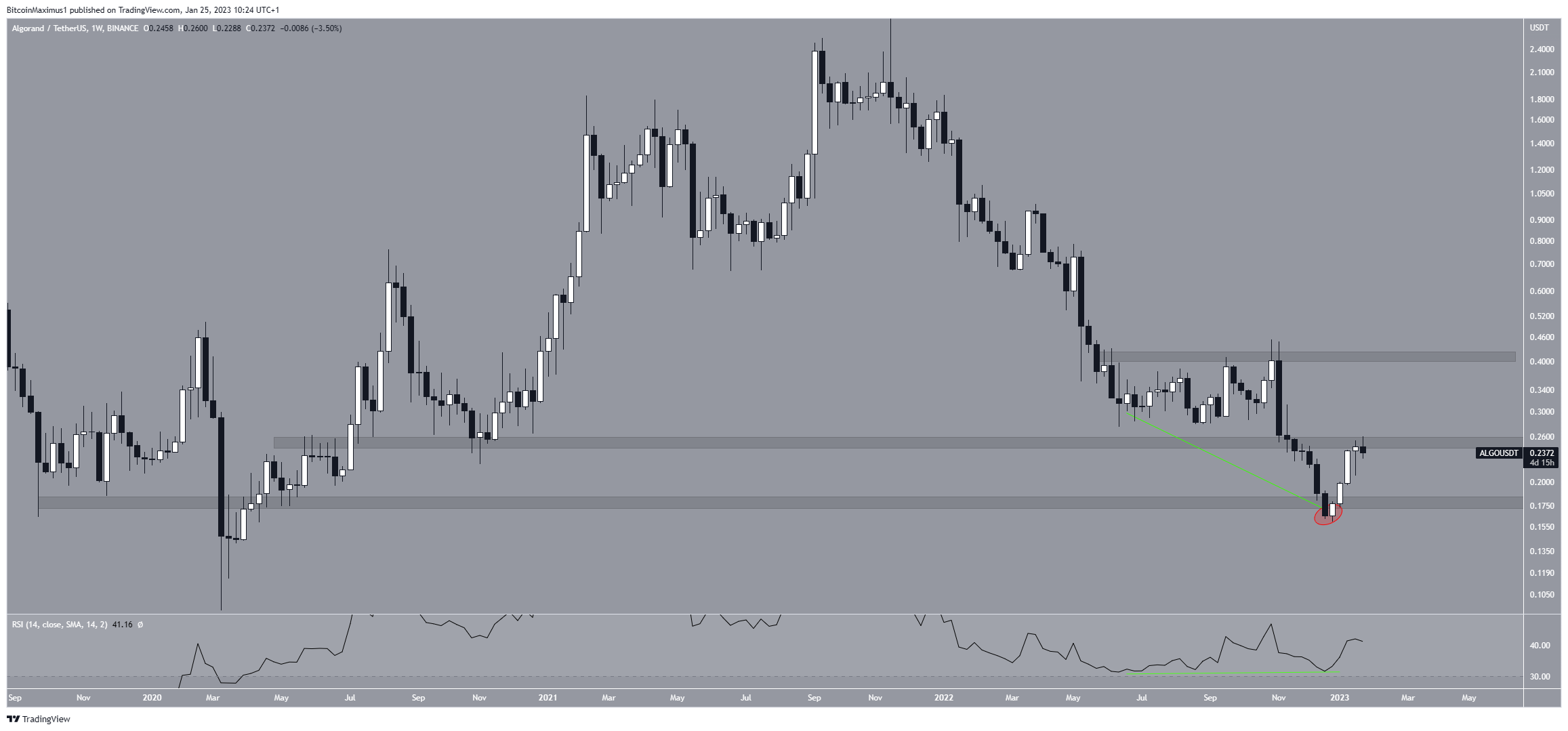 The Algorand price has fallen since reaching an all-time high of $2.99 in Nov. 2021. The decrease led to a minimum price of $0.16 in Dec. 2022. Measuring from the all-time high, this was a drop of 94.68%. It seemingly caused a breakdown from the $0.18 horizontal support area, which had been in place since the bull run began in March 2020.