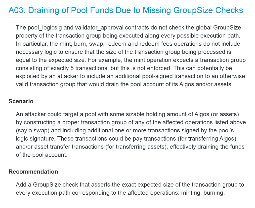 While Tinyman had previously had the contract audited, the exploit managed to fly under the radar. The audit managed to identify a different flaw during the process, which was fixed and reviewed. The audit confirmed that the previous flaw had been “fully addressed.” The previous flaw that was fixed related to a missing GroupSize check that could have allowed malicious transactions to be included in the group as explained below: