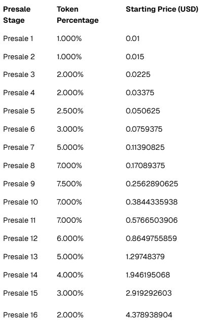 Each presale stage has a starting price that is at least 50% higher than the previous stage, incentivizing early participation. Below is a breakdown of the stages, the percentage of tokens available, and the corresponding starting prices: